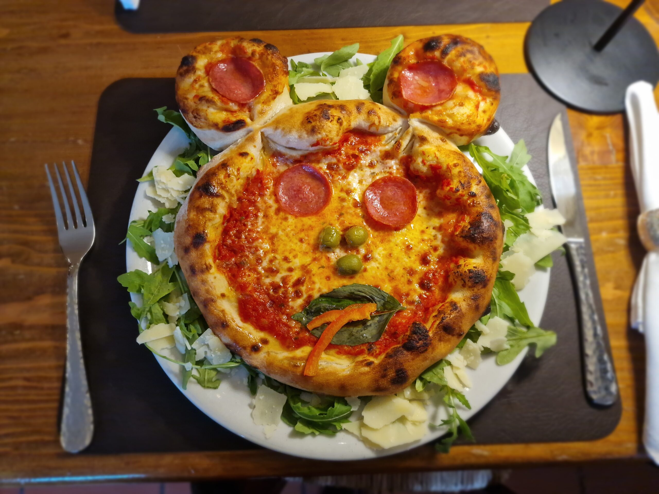 Unsere liebevoll gestaltete Pizza in Form einer Mickey Maus bringt Kinderaugen zum Leuchten.
